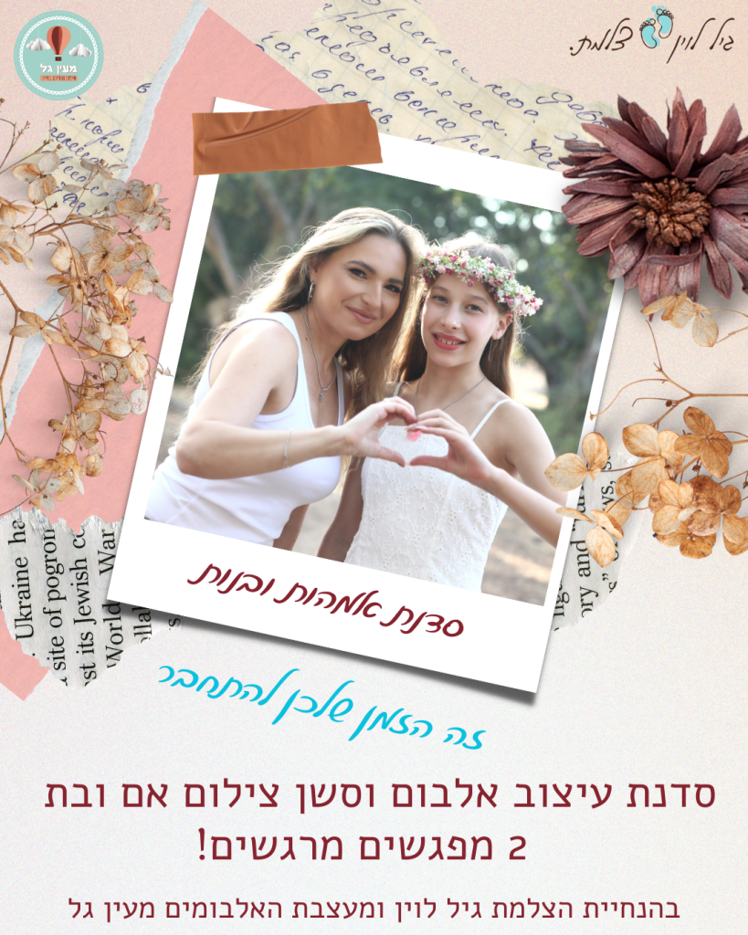 עלות סדנה קבוצתית לעיצוב אלבום זוגי של אמא ובת + תמונות מקצועיות מסשן הצילום – מינימום 6 זוגות – 450 ש"ח למשתתפת (900 ש"ח לזוג)